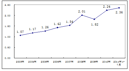 2003-2011年7月中国蜡烛产品出口均价走势 单位:美元/千克