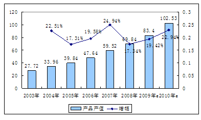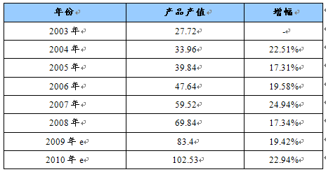 近几年我国冷冻压缩机 行业 通过技术的不断改进和生产规模的扩大, 行业 产品产值增长速度明显加快,年产值平均增长速度超过20%。其中一些大型生产企业生产能力极强。在这些大企业的带领下,2007年我国冷冻压缩机 行业 产值增幅达到了24.94%,成为历年来最高增幅水平。2008年 行业 全年产值为69.84亿元,增幅达到17.34%。