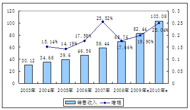 2003—2010年冷冻压缩机产品销售销售收入及预测图 单位:亿元