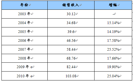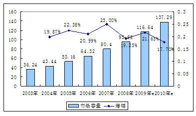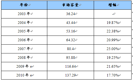 2003—2010年冷冻压缩机产品市场容量及预测表 单位:亿元