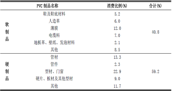 从我国目前的PVC制品消费结构来看,PVC 硬制品和软制品分别占59.2%和40.8%,其中,工业民用建筑工程是硬质PVC 的主要需求,管材约占13.3%的份额,型材、门窗占22.9%的市场份额;软制品中,用量最大的是薄膜。我国PVC 制品市场具体消费结构如下: