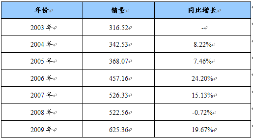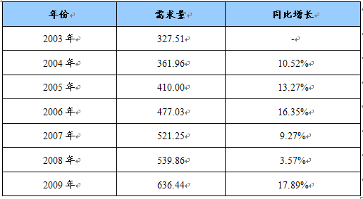 2003-2009年我国冷冻肉需求量及同比增长统计表 单位:万吨