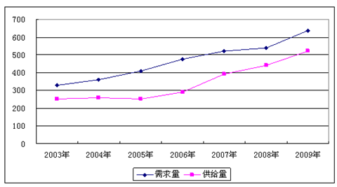 2003-2009年我国冷冻肉供需平衡图 单位:万吨