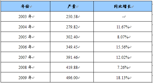 2003-2009年我国冷冻肉产量及同比增长统计表 单位:万吨