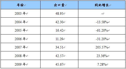2003-2009年我国冷冻肉出口量及同比增长统计表 单位:万吨