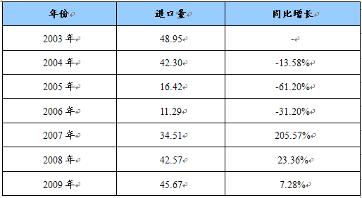 2003-2009年我国冷冻肉进口量及同比增长统计表 单位:万吨
