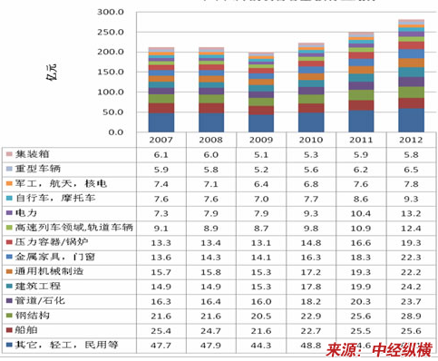 2007-2012中国焊割设备市场容量(按 行业 分)