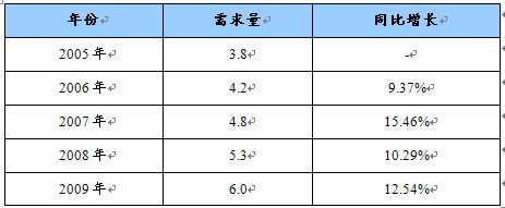 2005-2009年磷酸锌需求量及同比增长统计表 单位:万吨