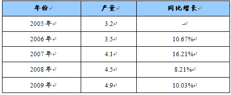 2005-2009年磷酸锌产量及同比增长统计表 单位:万吨
