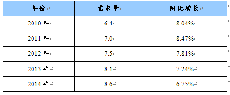2010-2014年磷酸锌需求量及同比增长预测表 单位:万吨