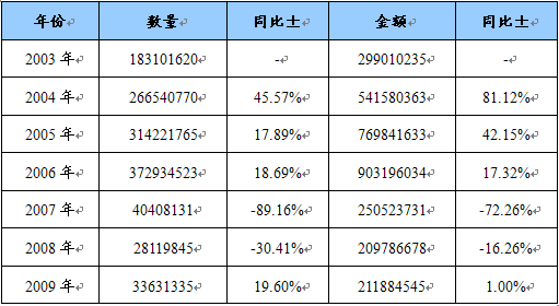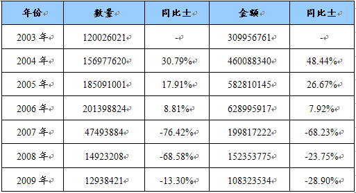 2003-2009年输出功率≤125瓦的未列名风机、风扇进口量值统计 单位:台