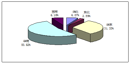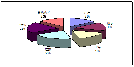 目前,我国已经取得生产许可证的空调风机主要集中在华东地区及广东等地。其在国内分布区域的比例如图所示。