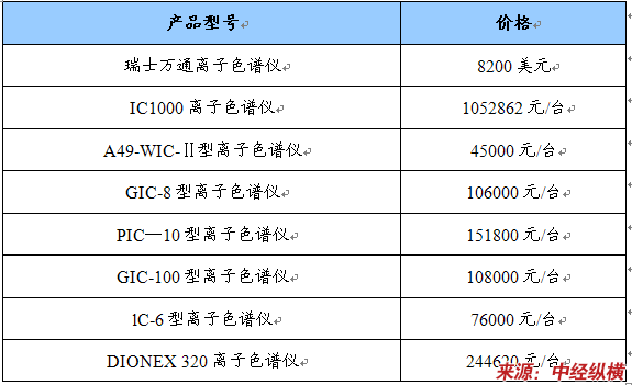 以上是近期部分离子色谱仪报价情况,我国开始研发离子色谱仪的时间较晚,国产品牌的应用有限,目前,主要还是国外品牌应用较多,其价格也相对昂贵,如上表所示,就有高达24万多元一台的,预计随着国内研发力度的加大,生产企业的增多,未来离子色谱仪的均价会有所下降。