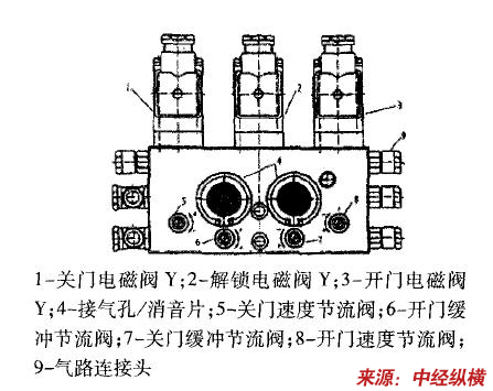 压缩空气的流向与流量由车门的中央控制阀来控制,以便实现双作用气缸的前进和后退,并通过钢丝绳、滑轮和驱动支架等组成的机械传动装置来进行车门的开/关动作,转动中央控制阀上的调节旋钮还可调整开关速度与缓冲速度。图2所示的中央控制阀,是控制车门的关键部件,它由用于车门开、关以及解锁的三台二位三通电磁阀与控制关门速度、开门速度、关门缓冲、开门缓冲等功能的四台气动节流阀集成。