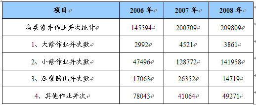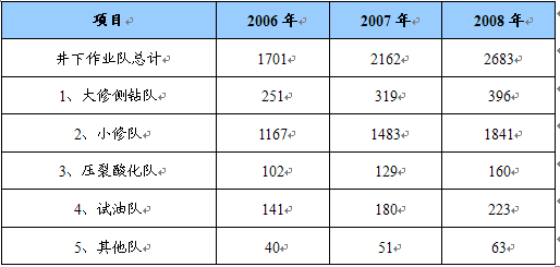 目前,井下作业基本能够满足生产需要,但是,随着勘探开发的不断深入,对井下作业技术又提出了新的更高要求,近三年来我国井下作业调查数据如下: