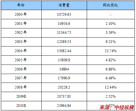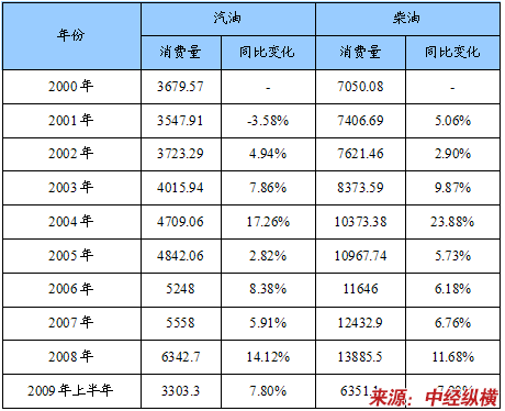2000—2010年成品油(汽油、柴油)消费量统计及预测
