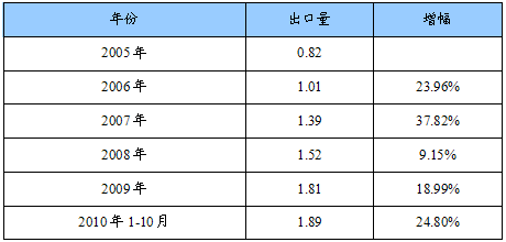 2005-2010年1-10月我国家具用塑料缓冲垫、脚垫产品出口量