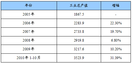 到2010年我国家具 行业 规模以上企业5746家,累计完成工业总产值3523.95亿元,比2009年同期增长31.39%;2010年1-10月份累计完成工业销售产值3425.39亿元,比09年同期增长30.33%。同期,家具 行业 累计出口2688762.9万美元,比09年同期增长32.39%;累计进口136316.1万美元,比09年同期增长33.30%。