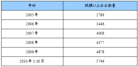 2005-2010年1-10月我国家具制造业规模以上企业数量统计
