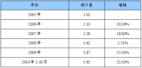 2005-2010年1-10月我国家具用塑料缓冲垫、脚垫产品进口量 分析