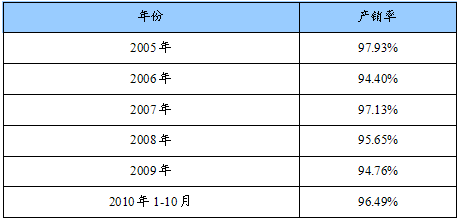2005-2010年1-10月我国家具用塑料缓冲垫、脚垫产销率统计