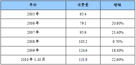 2005-2010年1-10月我国家具用塑料缓冲垫、脚垫产品消费量统计