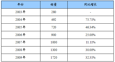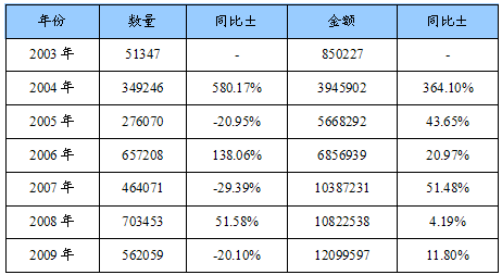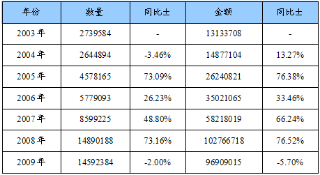 2003-2009年家用型水的过滤、净化机器及装置出口量数据及同比增长统计表
