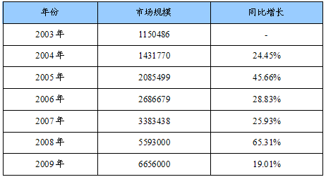 2003-2009年溅射靶材需求量(市场规模)及同比增长统计表