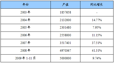 2003-2009年溅射靶材产值及同比增长统计表