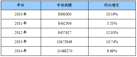 2010-2014年溅射靶材需求量(市场规模)及同比增长预测表