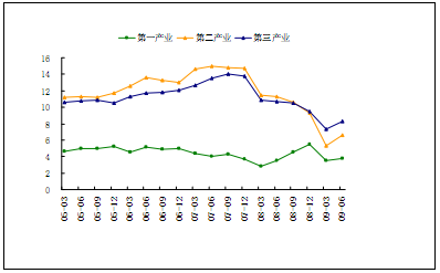 2009年1-6月,国内生产总值139862亿元,同比增长7.1%。其中,一季度增长6.1%,二季度增长7.9%。分产业看,第一产业增加值12025亿元,增长3.8%;第二产业增加值70070亿元,增长6.6%;第三产业增加值57767亿元,增长8.3%。