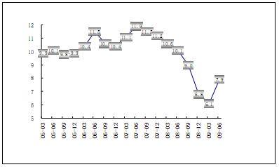 2009年上半年,居民消费价格同比下降1.1%,其中6月份同比下降1.7%,环比下降0.5%;工业品出厂价格同比下降5.9%,6月份同比下降7.8%。自今年2月份以来,CPI和PPI双双步入负区间运行,PPI降幅逐月下探,屡创新低,6月份CPI更创十年新低。6月份CPI、PPI数据均不太乐观,最主要的是环比也出现下降,市场普遍预期的“通胀”短期内难以出现,“通缩”风险并没有消除,而且有可能还在恶化。