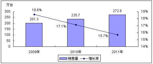 2009年中国数码摄像机市场销售量将达到201.3万台,同比增长18.6%,到2011年数码摄像机销售量将达到272.8万台,2009-2011年中国数码摄像机市场销量年均复合增长率达到17.1%。