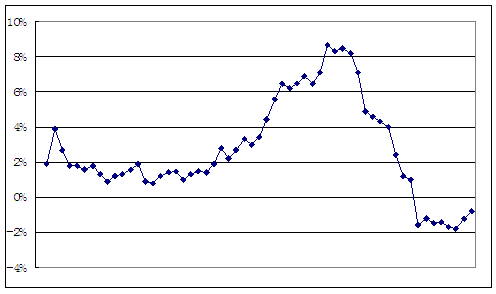 2)2008年7月至10月间,国内外经济局势不确定性风险增大,物价有所回落,宏观调控政策以保增长和控物价为宏调首要任务
