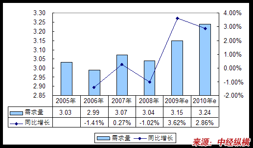 从我国石蜡产量及两大集团09年产量来看,我国石蜡产量正呈逐年递减态势,预计2009年产量同比08年下降5%左右,2010年产量仍然呈递减态势。