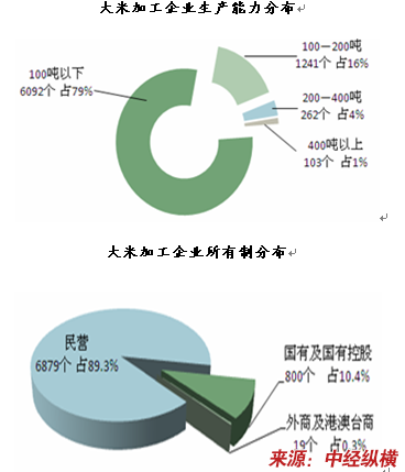 2007年全国入统大米加工企业7698个,比上年增加150个,年生产能力14666万吨,其中:日加工能力100吨以下6092个,占79.1%,比上年减少51个;100-200吨1241个,占16.1%,比上年增加182个;200-400吨262个,占3.4%,比上年增加11个;400吨以上的大中型企业103个,占1.3%,比上年增加8个。在入统大米加工企业中,国有及国有控股企业800个,占10.4%,比上年减少48个;外商及港澳台商投资企业19个,占0.2%,比上年减少5个;民营企业6879个,占89.4%,比上年增加203个。