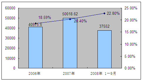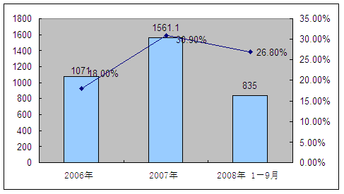 2006-2008年9月我国建筑业总产值及增长情况