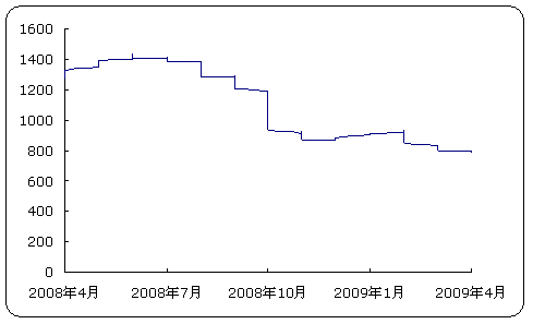由于产量过剩、下游需求不振以及出口萎靡等因素影响,钢材价格在进入2月份以来不断下跌,下图为2008年4月份以来宝山钢市综合指数成交均价指数。从下图中可以看出金融危机全面爆发以来,我国钢铁产品价格急速下滑。