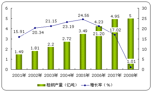 2001-2008年我国粗钢产量及其增长率变化