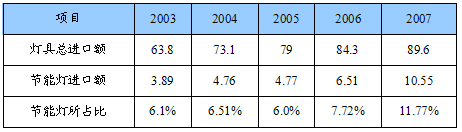 还可以看出,美国灯具总进口额从2003年的63.8亿美元增加至2007年的89.6亿美元,而节能灯进口所占比例,则从6.1%增加至11.77%。