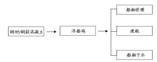 浮船坞是修船业最重要的生产设备,一般为钢结构,也有用钢筋混凝土制造的浮船坞。浮船坞主要用于船舶修理、渡航以及船舶下水等。