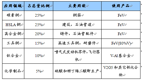 在我国,钒90%左右用于钢铁工业,钒在钢中的应用主要是通过添加钒来提高强度和韧性。在结构钢中加入0.1%的钒,可提高强度10%—20%,减轻结构重量15%—25%,降低成本8%—10%。若采用含钒高强度钢时,可减轻金属结构重量40-50%,比普通结构钢的成本低15-30%。由于钒钢具有强度大,韧性、耐磨性及耐蚀性好的特点而广泛应用于输油(气)管道、建筑、桥梁、钢轨和压力容器等工程建设中。