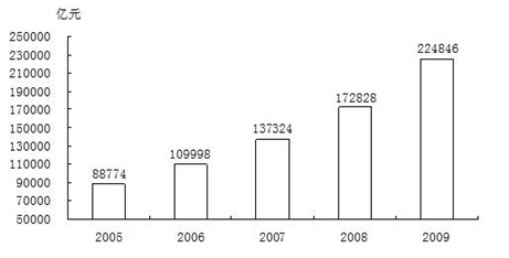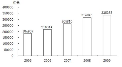初步核算,2009年全年国内生产总值335353亿元,比上年增长8.7%。分产业看,第一产业增加值35477亿元,增长4.2%;第二产业增加值156958亿元,增长9.5%;第三产业增加值142918亿元,增长8.9%。第一产业增加值占国内生产总值的比重为10.6%,比上年下降0.1个百分点;第二产业增加值比重为46.8%,下降0.7个百分点;第三产业增加值比重为42.6%,上升0.8个百分点。