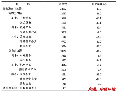 全年货物进出口总额22072亿美元,比上年下降13.9%。其中,货物出口12017亿美元,下降16.0%;货物进口10056亿美元,下降11.2%。进出口差额(出口减进口)1961亿美元,比上年减少1020亿美元。