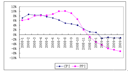 具体而言,世界经济结束金融恐慌进入可预期的衰退阶段,金融危机已经转化为经济危机,预计外需在半年内还将持续同比下跌15%以上,中国的实体经济将不得不继续等待机遇;政府通过直接投资扩大了公共需求,通过补贴诱导与金融信贷条件改善,较好地刺激了内部市场需求,投资在三季度会保持在30%以上的增速,而以汽车与房地产为代表的消费也将维持在15%左右的名义增长水平上。此外,全年通货膨胀率预计在0.5%。09年2-8月中国经济进入长达7个月的通货紧缩期,9月后物价将开始变正,11月与12月将维持在2%的水平上,全年物价上涨率预计不超过0.5%。