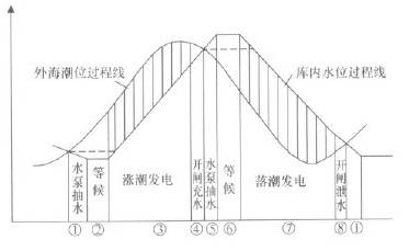 在单向方式中水头变化范围较小,平均工作水头略高,这样可以减少水轮机的数量和尺寸,从而减少潮汐电站的投资;而在潮差较小、海湾条件允许的电站,采用双向工作比较有利。