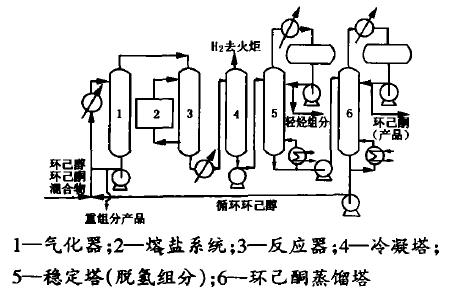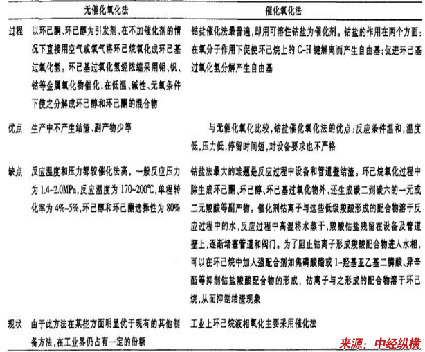 工业上生产环己酮的方法主要有环己烷液相氧化法、苯酚加氢法、环己烯水合法等。目前,世界上绝大部分环己酮采用环己烷部分氧化法制备,其中环己烷同苯加氢得来。工业上环己烷液相氧化包括催化氧化和无催化氧化的路线。这2种路线的比较如下图所示: