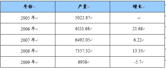 2005年-2009年我国原木产量及增长情况 单位:万立方米,%