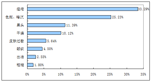 由于年龄和日常习惯使然,痤疮带来的困扰备受关注,2009年痤疮成为最受关注的肌肤问题,关注度达到33.29%,排名第一。色斑、暗沉则以25.23%的关注度位居第二,显示中国女性对美白的狂热需求仍是热度不减。黑头和干燥分列第三和第四,关注度分别为11.39%和10.12%,这两方面的肌肤问题分别是普通人群在夏季和冬季时肌肤会遇到的最常见困扰。