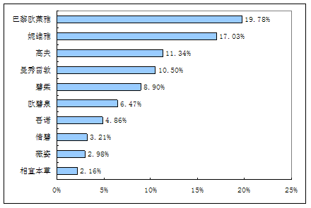 2009年消费者对护肤品的关注度远高于其它品类,整体关注度占比为68.88%,彩妆品排名第二,达到19.55%。护肤和彩妆两类的合计关注度高达近9成。